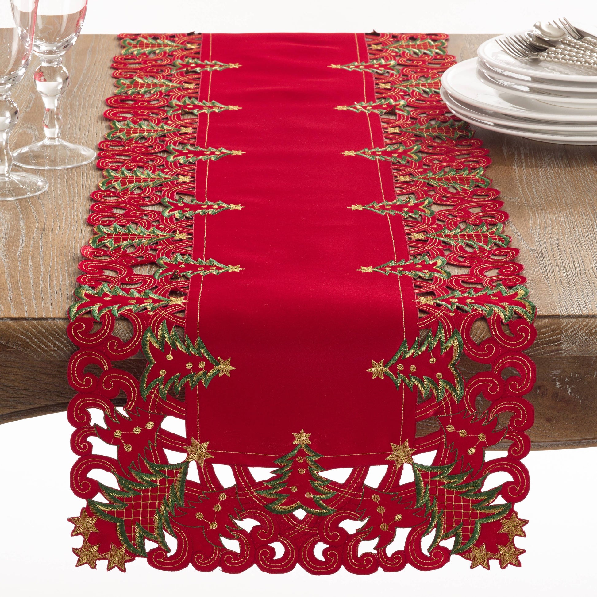 Give your holiday dinner table a festive and elegant look with this Christmas tree design table runner. Featuring a design with a familiar holiday theme, the embroidered golden stars also add a sparkling touch. Create a special setting for either family gatherings or holiday dinner parties and complete your table with coordinating dinnerware and accents.