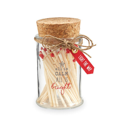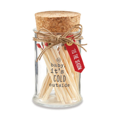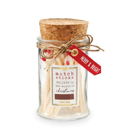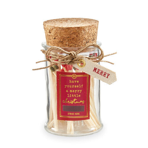 50 matchsticks arrive in a glass bottle with a cork stopper, printed exterior, striking strip, and grommeted printed sentiment canvas tag.