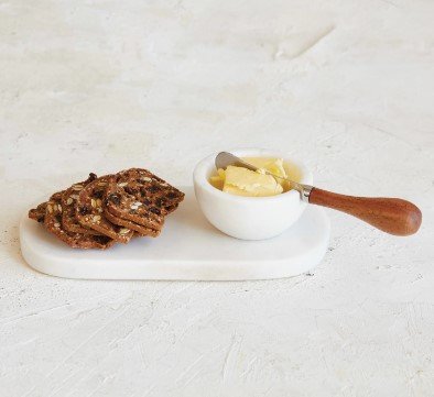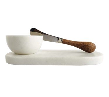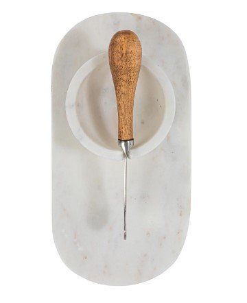 Serve guests with style and elegance with this white marble cheese board set with a bowl and knife. This cheese board set is crafted from marble, a natural stone that has a smooth surface and a stunning white color that varies with each piece. This cheese board set can serve a variety of foods, such as cheese, crackers, meats, fruits, nuts, and more. It comes with a matching bowl that can hold dips, sauces, or olives, and a mango wood canape knife that can cut and spread cheese with ease. It has an oval shape that adds character and charm to the table setting. It can enhance any style, from farmhouse to modern, with its minimalist design and boho vibe. It can also create a coastal feel with its white and natural colors. It is also easy to clean and store, making it a convenient and versatile accessory for the home. Order them today and enjoy the elegance and quality of this white marble cheese board set with bowl and knife.