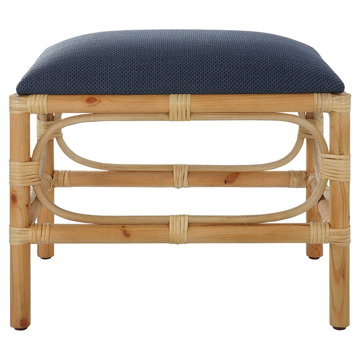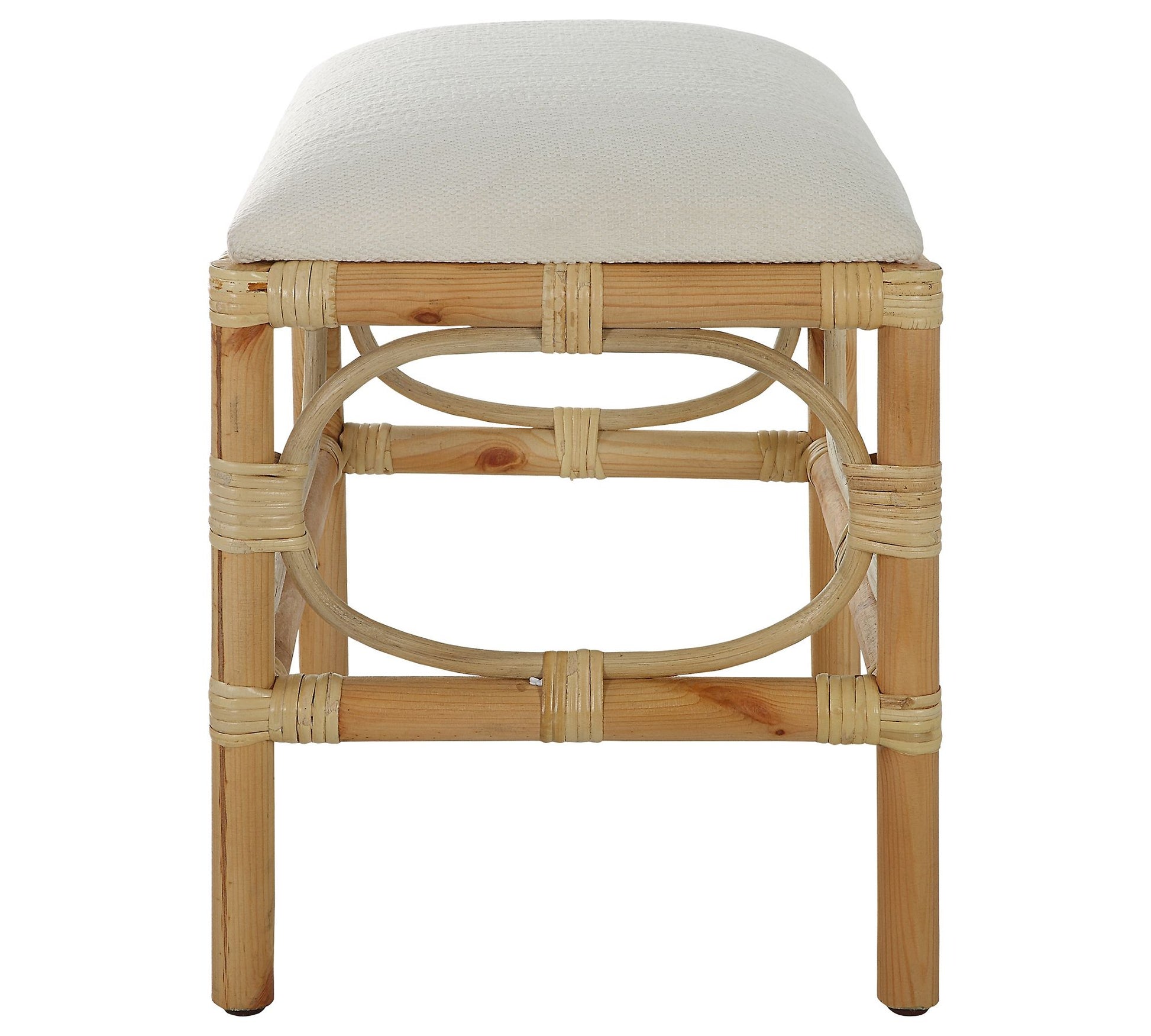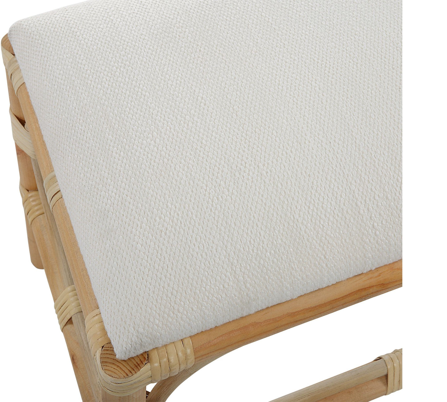 White bench/ottoman with rattan-wrapped natural wooden legs.