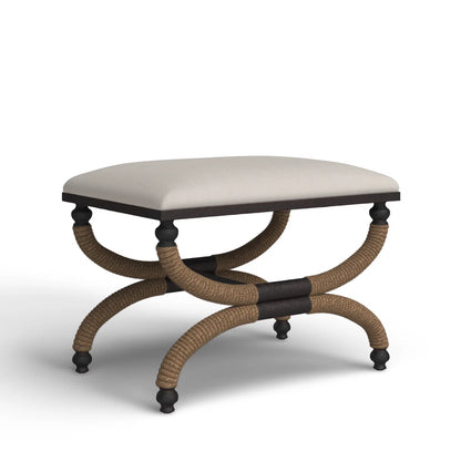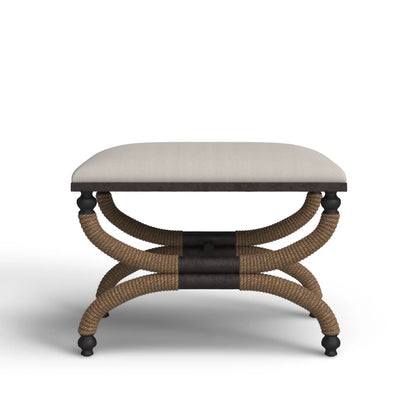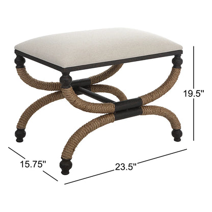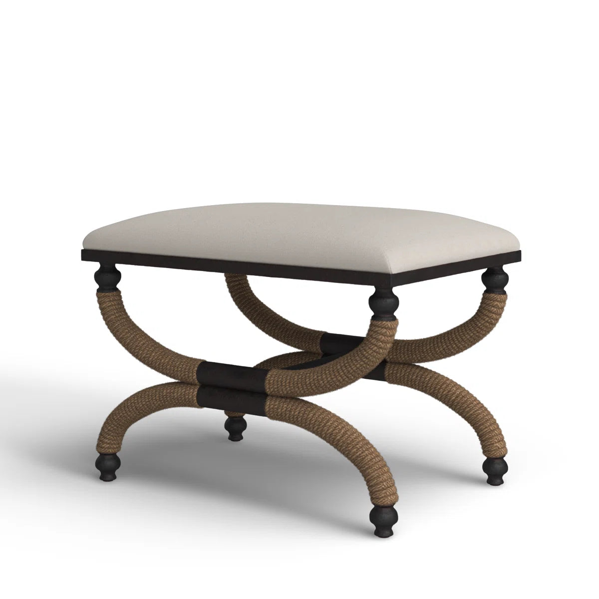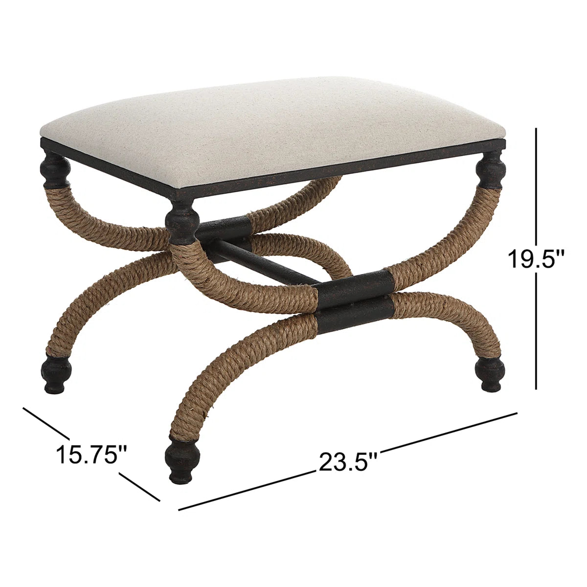 The Icaria bench features a rustic curved iron frame with a nautical touch, wrapped in natural fiber rope accents. The cushioned top is upholstered in an oatmeal cotton blend fabric
