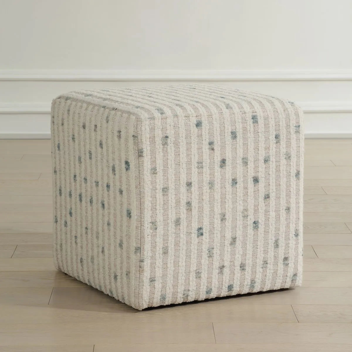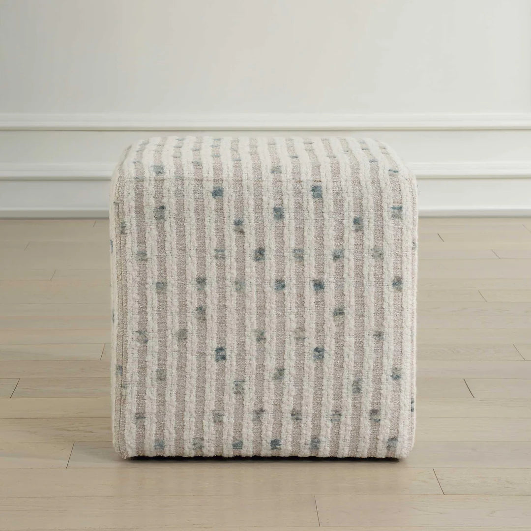 Serving as both a standalone accent piece or functional seating, the Joie ottoman is sure to add comfort and style to your space. Covered in an ultra plush white chenille stripe over a flax ground with a fun dot of sea blue.