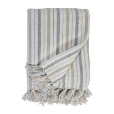 The Naples Collection is a 100% heavy weight hand loomed linen that features alternating thick and thin stripes in a cool color palette of ocean blue and a natrual taupe surrounded by soft tassels.